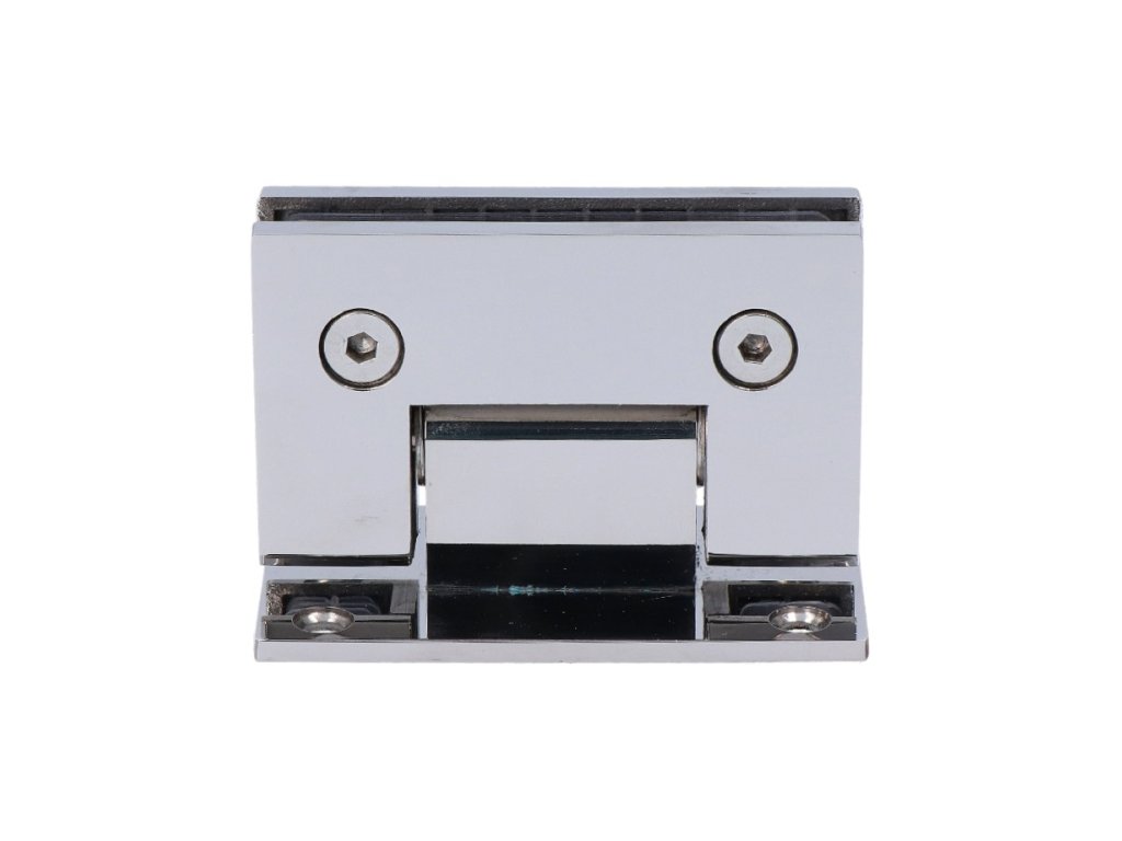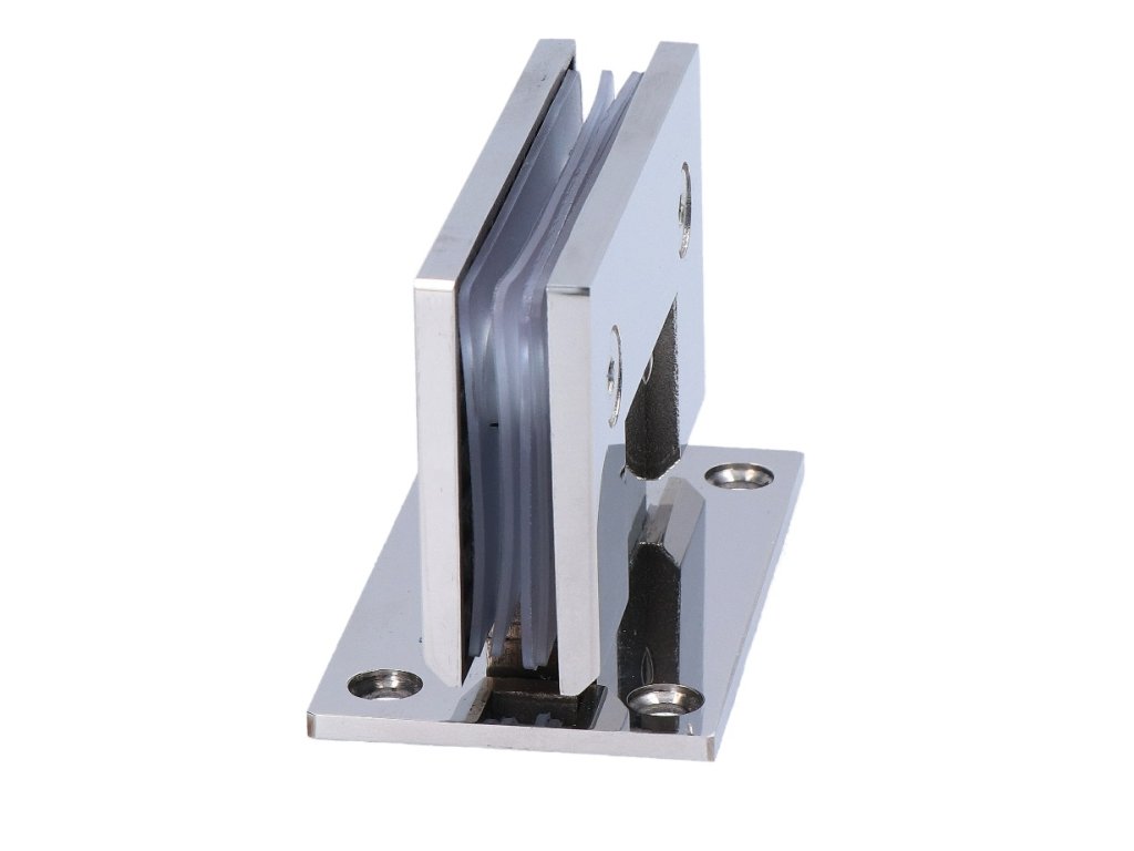 Záves na sklenený dverový systém, medzi stenu a sklo, 90x53x62mm, hrúbka skla 8-10mm, leštená nerez AISI304, samozatváranie +-15° a samozatváranie +-90°