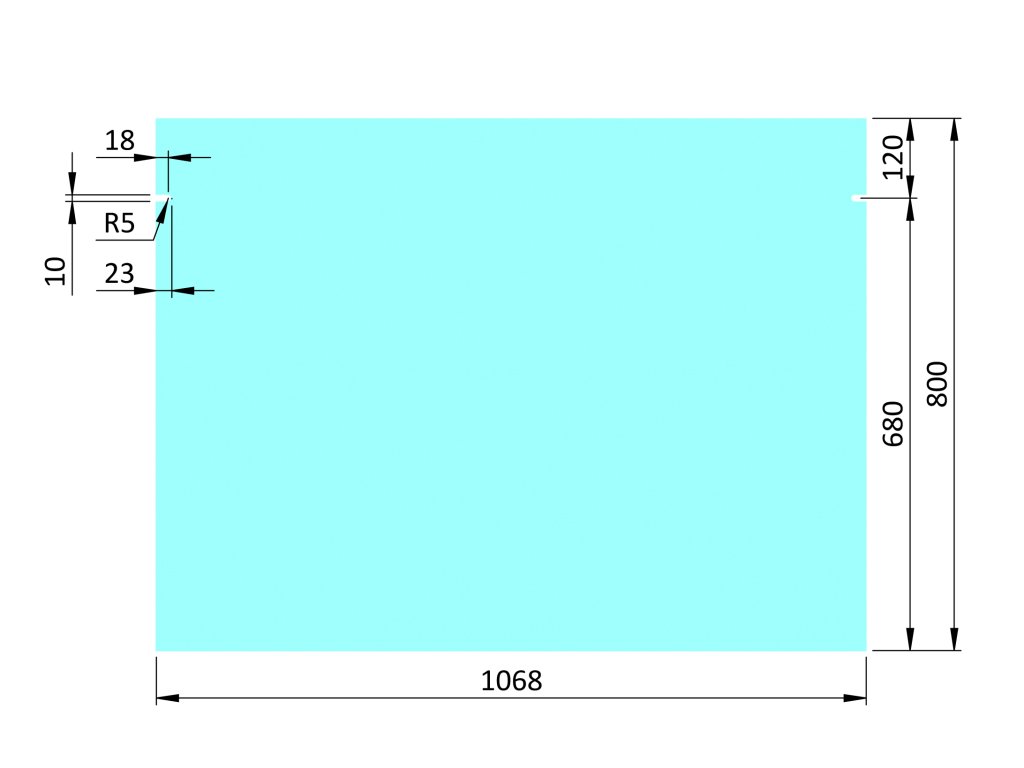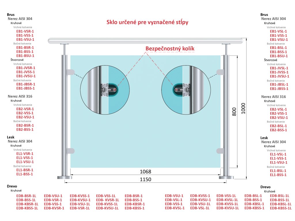 Transparentné ESG / VSG sklo pre osovú vzdialenosť medzi stĺpikmi 1150mm, rozmer 1068x800mm, hrúbka: 8.76mm s fóliou a výrezmi pre bezpečnostný kolík