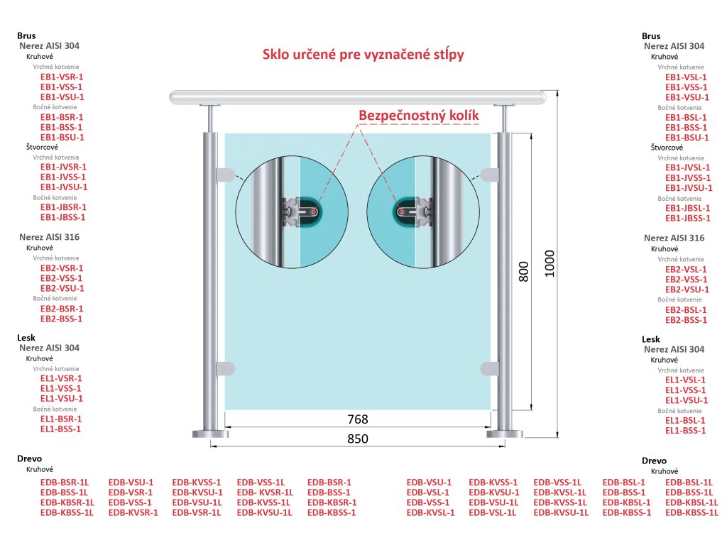 Transparentné ESG / VSG sklo pre osovú vzdialenosť medzi stĺpikmi 850mm, rozmer 768x800mm, hrúbka: 8.76mm s fóliou a výrezmi pre bezpečnostný kolík
