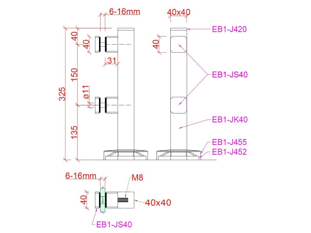 Nerezový stĺpik na sklo s dvomi svorkami ø40mm, celková výška: 325mm, pre sklo: 6-16mm brúsená nerez K320 / AISI 304. (Balenie obsahuje gumičky na sklo)