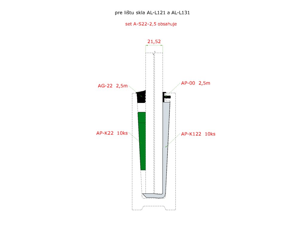 2.5m set pre 21.52mm sklo, k profilu AL-L121, AL-L131, AL-L141 a AL-L151. Obsahuje: tesnenie AG-00 2.5m, AG-22 2.5m, podložka AP-K122 10ks, klin AP-K22 10ks.