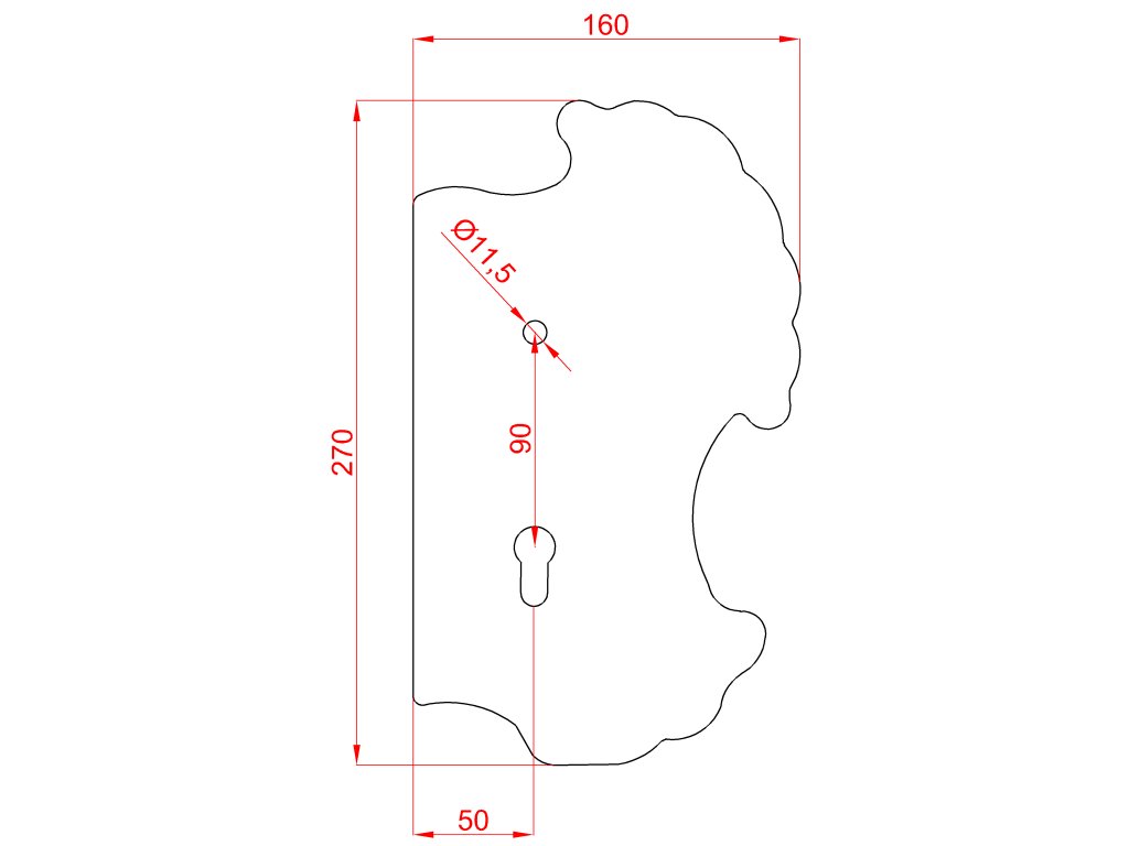 Štít 270x160x3mm s otvormi, rozteč 90mm, otvor pre kľučku ø 11,5mm, zdobený, pravý, pre zámok ZM90/80
