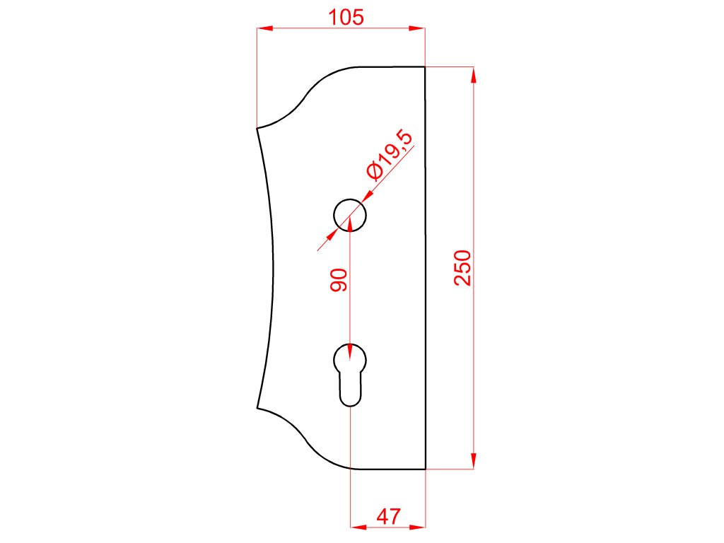 Štít 250x104x3mm s otvormi, otvor na kľučku ø 19,5mm, hladký, obojstranný (ľavý aj pravý), pre zámok ZM90/80