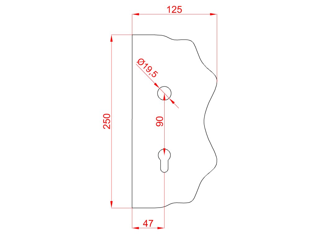 Štít 250x125x3mm s otvormi, otvor pre kľučku ø 19,5mm, zdobený, pravý, pre zámok ZM90/80