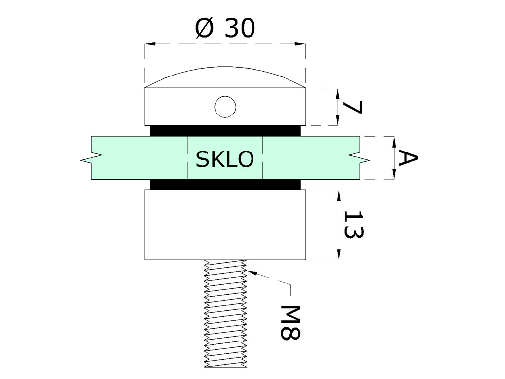 svorka bodová na sklo 6-12mm plochá (ø 30mm / M8), leštená nerez /AISI304, balenie obsahuje gumičky na sklo