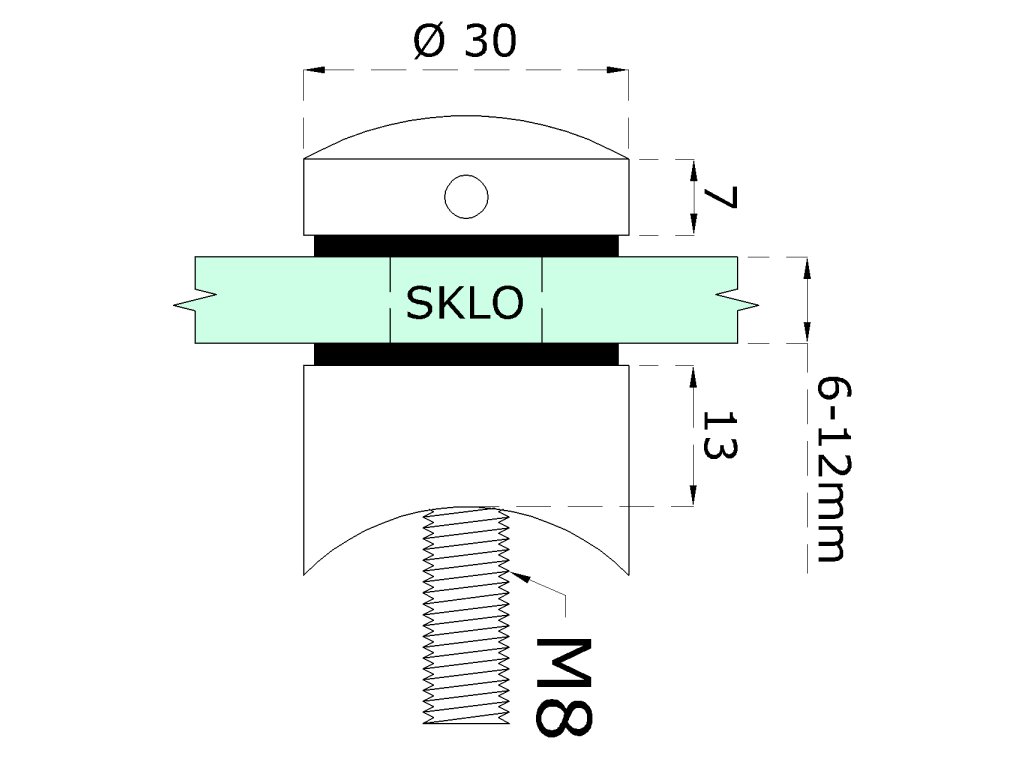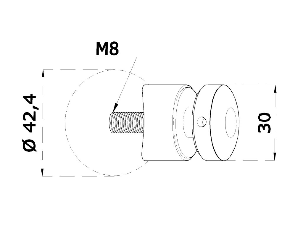 svorka bodová na sklo 6-12mm na trubku ø 42.4mm (ø 30mm / M8), brúsená nerez K320 /AISI304, balenie obsahuje gumičky na sklo