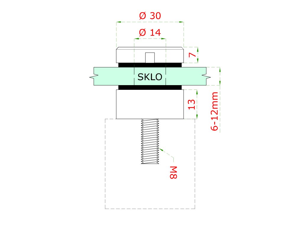 svorka bodová na sklo 6-12mm plochá (ø 30mm / M8), brúsená nerez K320 /AISI304, balenie obsahuje gumičky na sklo