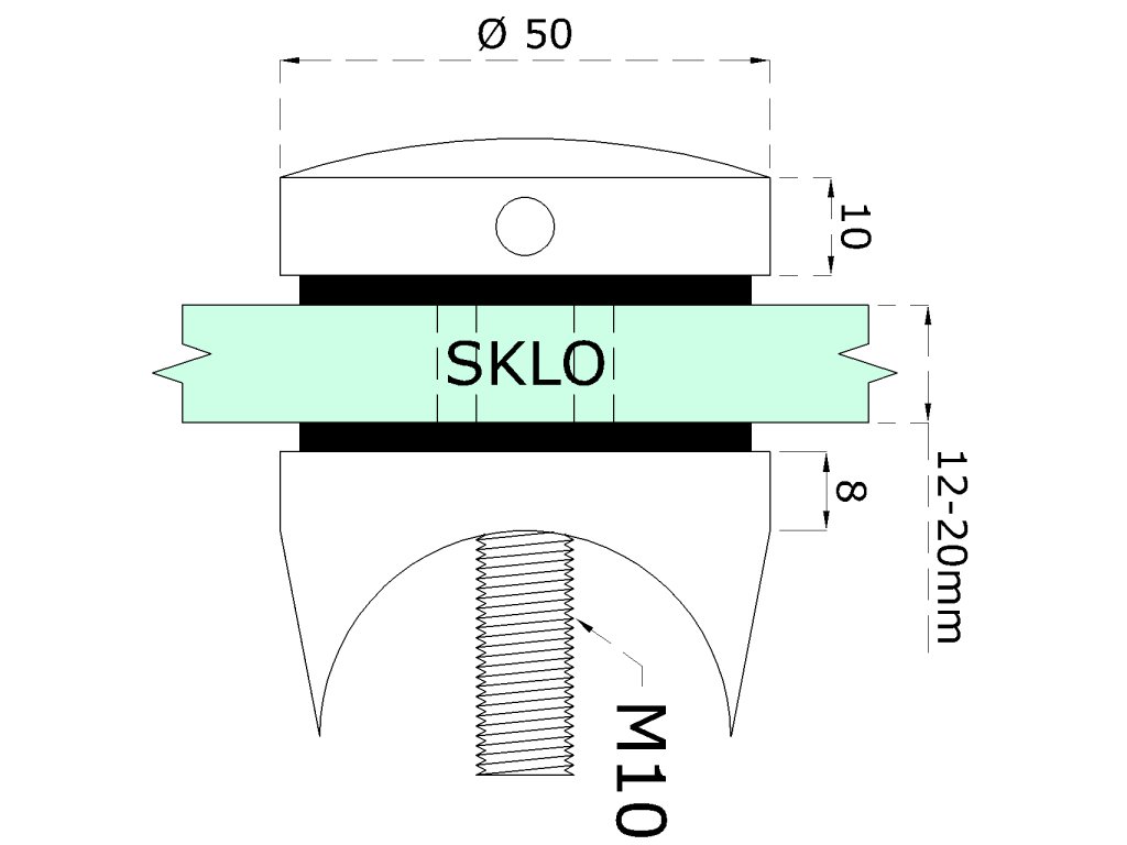svorka bodová na sklo 12-20mm na trubku ø 42.4mm (ø 50mm / M10, brúsená nerez K320 /AISI304, balenie obsahuje gumičky na sklo