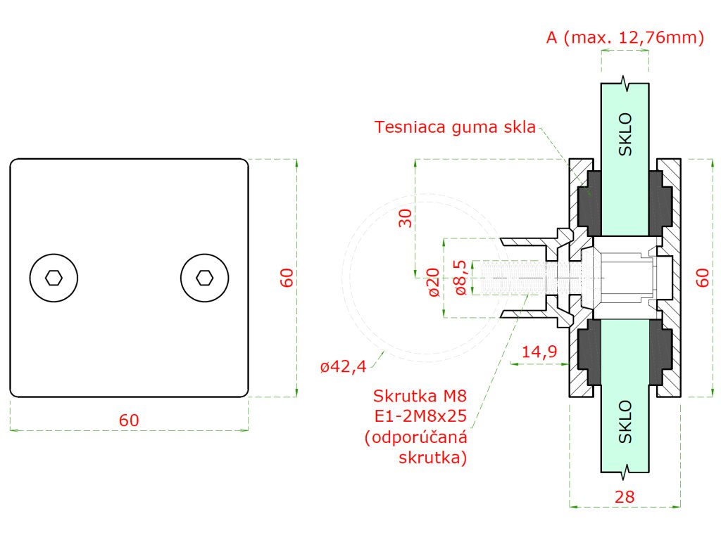 Svorka skla priama na trubku ø42.4mm (60x60x28mm), na sklo 8-12.76mm, brúsená nerez K320 /AISI304, balenie neobsahuje gumičky na sklo- potrebné 2 balenia EG-175