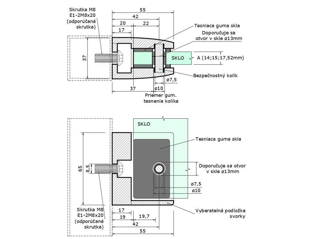 Svorka plochá na 40 x 40 mm, sklo 14 - 17,52 mm, AISI 304