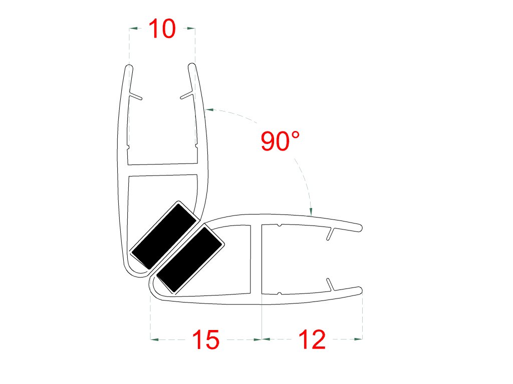 Plastové tesnenia magnetické, sklo 10 mm, 90°, L = 2200 mm