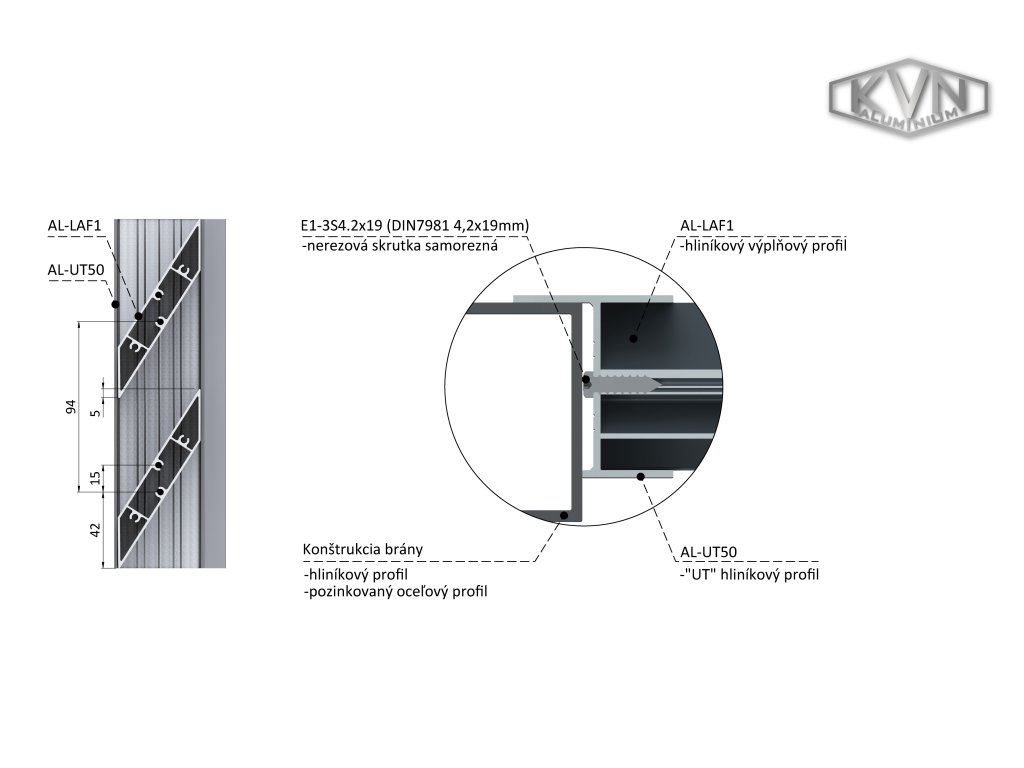 UT profil AL-UT50-6 je vhodné využiť pri montáži výplní z lamiel AL-LAZ3-6, AL-LAZ4-6, AL-LA05-6 a AL-LAF1-6. Vodiace čiary, vyfrézované do vonkajšej časti profilu AL-UT50-6 zjednodušia meranie rozostupov a presnosť umiestnenia výplne. Pre ideálne spojenie UT profilu s lamelami je vhodné použiť nerezové skrutky E1-3S4.2 s polguľatými hlavami, ktoré zabránia korózii. UT profily dokážu eliminovať nerovnosti či odchýlky osadenia plotových a bránových stĺpov. Pomáhajú upraviť nerovné línie vonkajšej konštrukcie výplní.