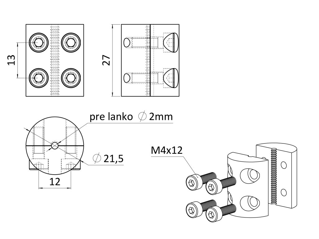 Úchyt pre nerezové lanko ø2mm so štyrmi skrutkami (barelová svorka), brúsená nerez K320/AISI304