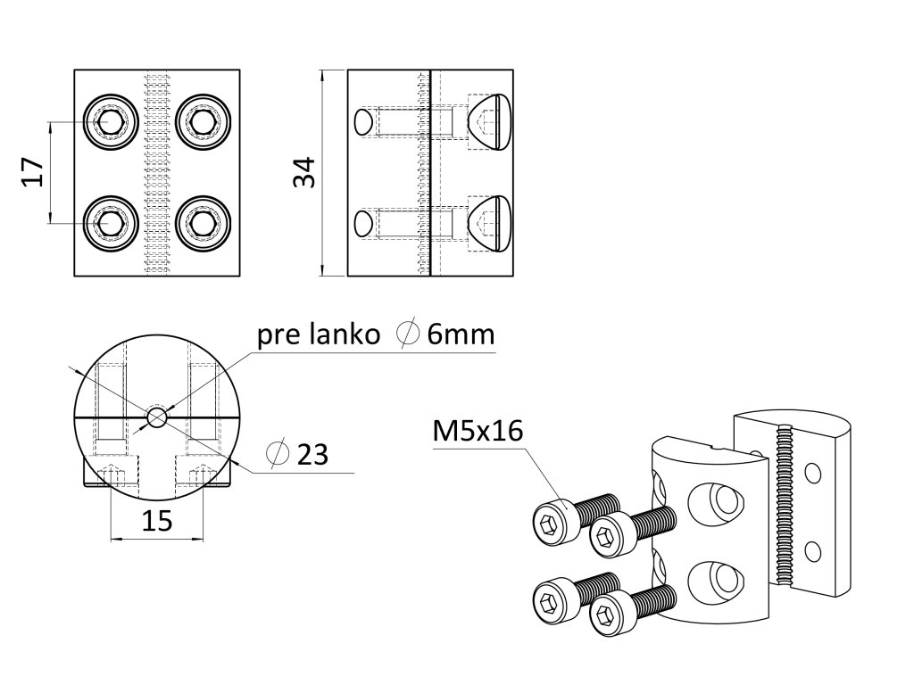 Úchyt pre nerezové lanko ø6mm so štyrmi skrutkami (barelová svorka), brúsená nerez K320/AISI304