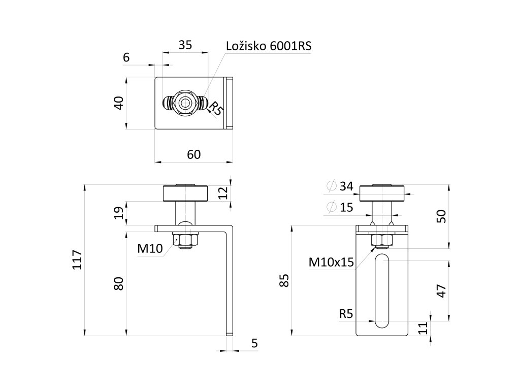 vodiace koliesko polyamidové s ložiskom ø 35mm, uholník nastaviteľný (60x85mm)