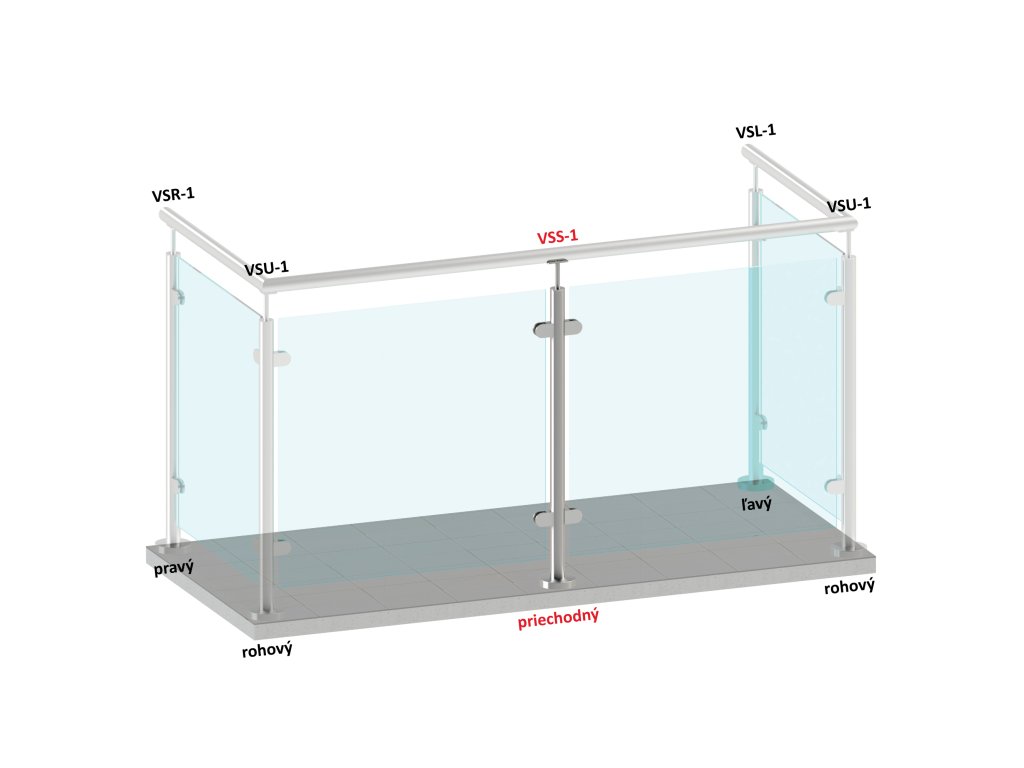 Nerezový stĺp, vrchné kotvenie, výplň: sklo, priechodný