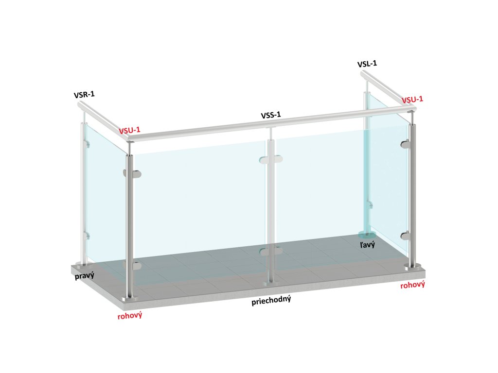 Nerezový stĺp, vrchné kotvenie, výplň: sklo, rohový: 90°