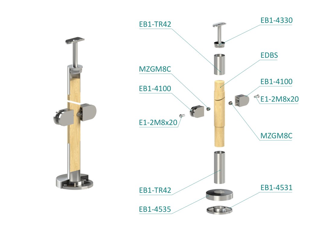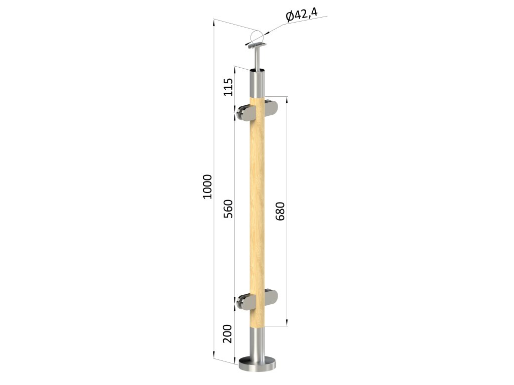 Drevený stĺp, vrchné kotvenie, výplň: sklo, priechodný