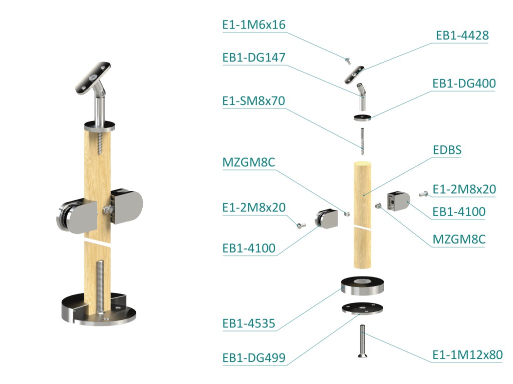 Drevený stĺp, vrchné kotvenie, výplň: sklo, priechodný