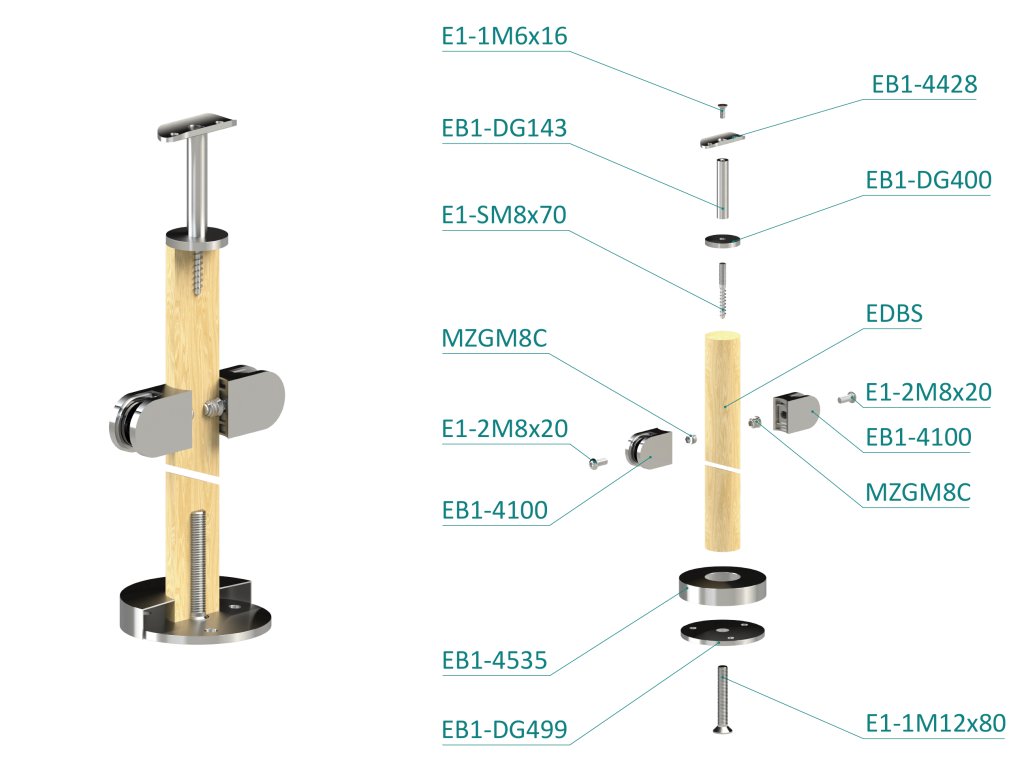 Drevený stĺp, vrchné kotvenie, výplň: sklo, priechodný