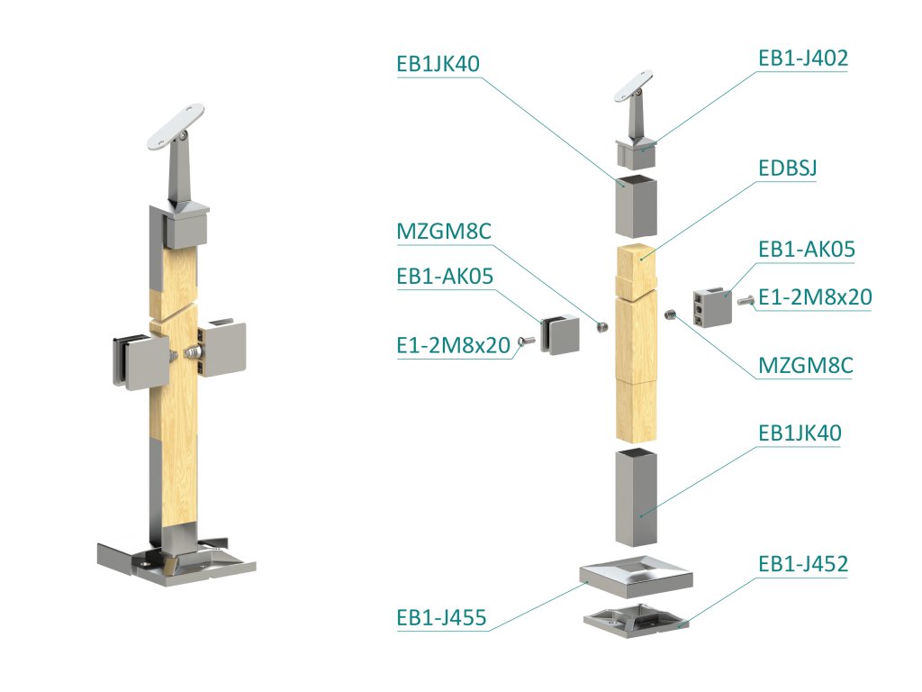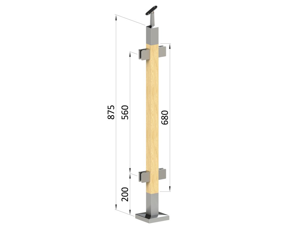 Drevený stĺp, vrchné kotvenie, výplň: sklo, priechodný
