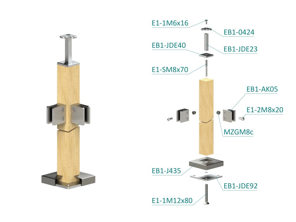 Drevený stĺp, vrchné kotvenie, výplň: sklo, rohový: 90°
