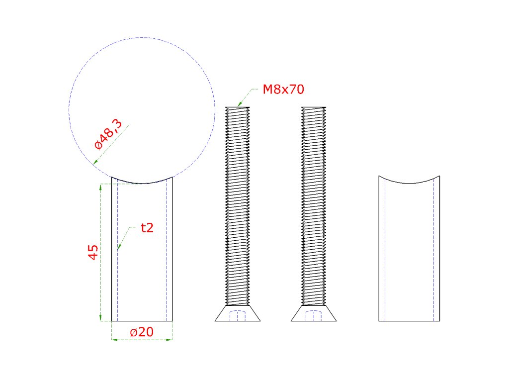 Prechod na vymedzenie vzdialenosti medzi stĺpom ø 48.3mm a kotviacou platňou, ø 20x2.0mm /L:45mm, vnút. skrutka: M8x70mm, brúsená nerez K320 /AISI304, bal: 2ks