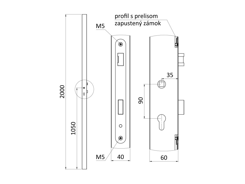 Profil 60 x 40 x 1,5 mm, výška 1500 mm, so zapusteným zámkom vhodným pre rám bránky. Profil je dodávaný pozinkovaný. Zámok je obojstranný, vhodný pre pravé aj ľavé otváranie.