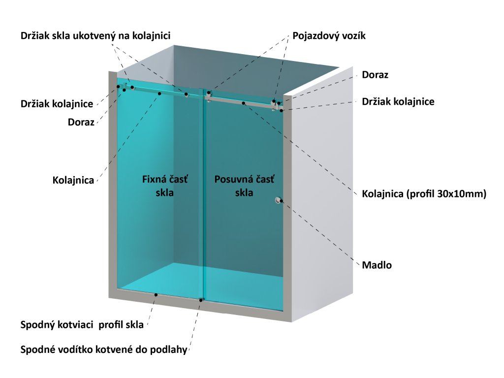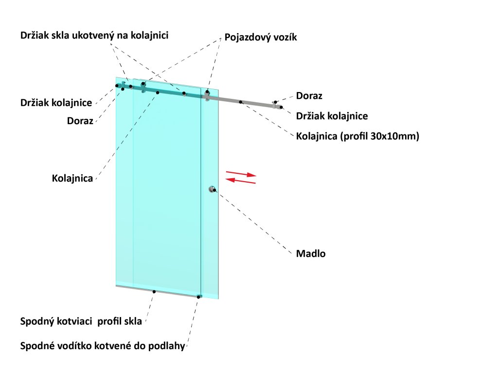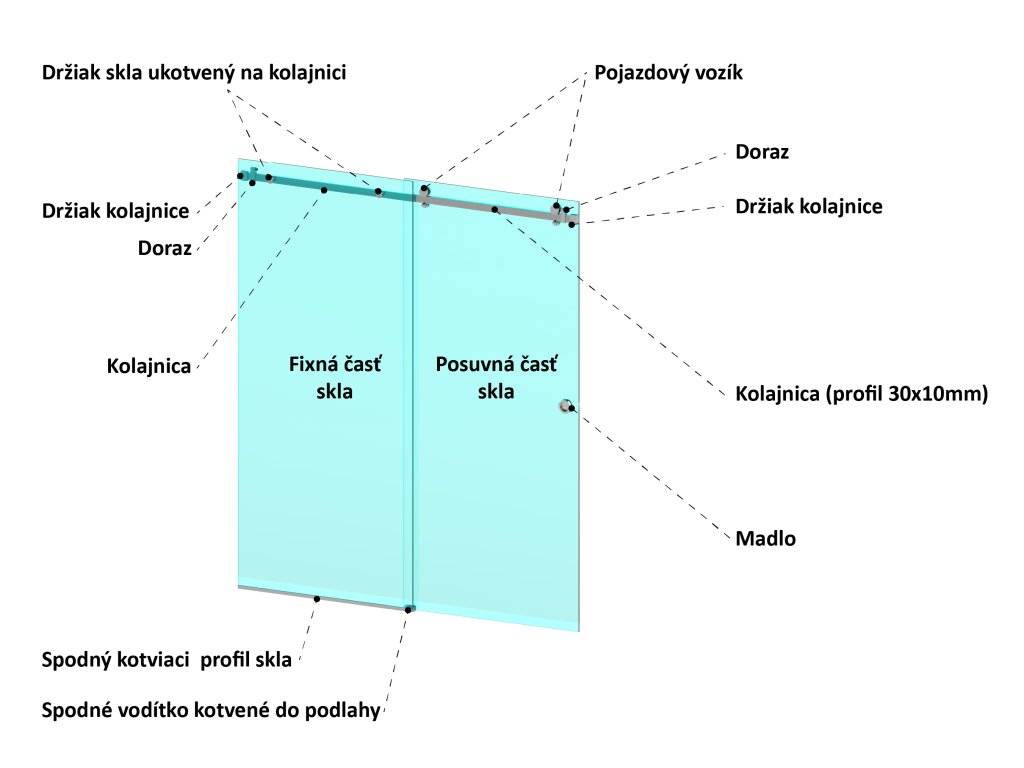 - 2 ks držiakov skla ukotvených na kolajnici