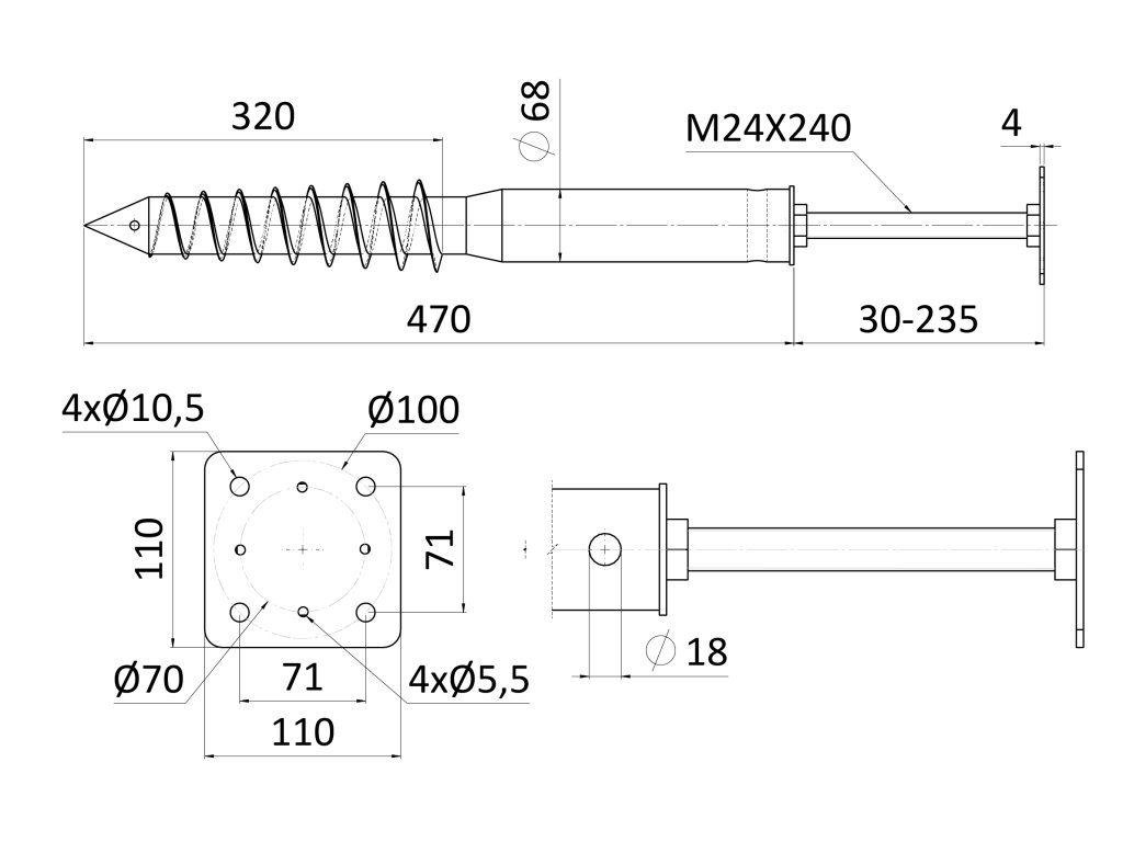Zemný vrut, pätka M24, 110 x 110 mm, zinková farba