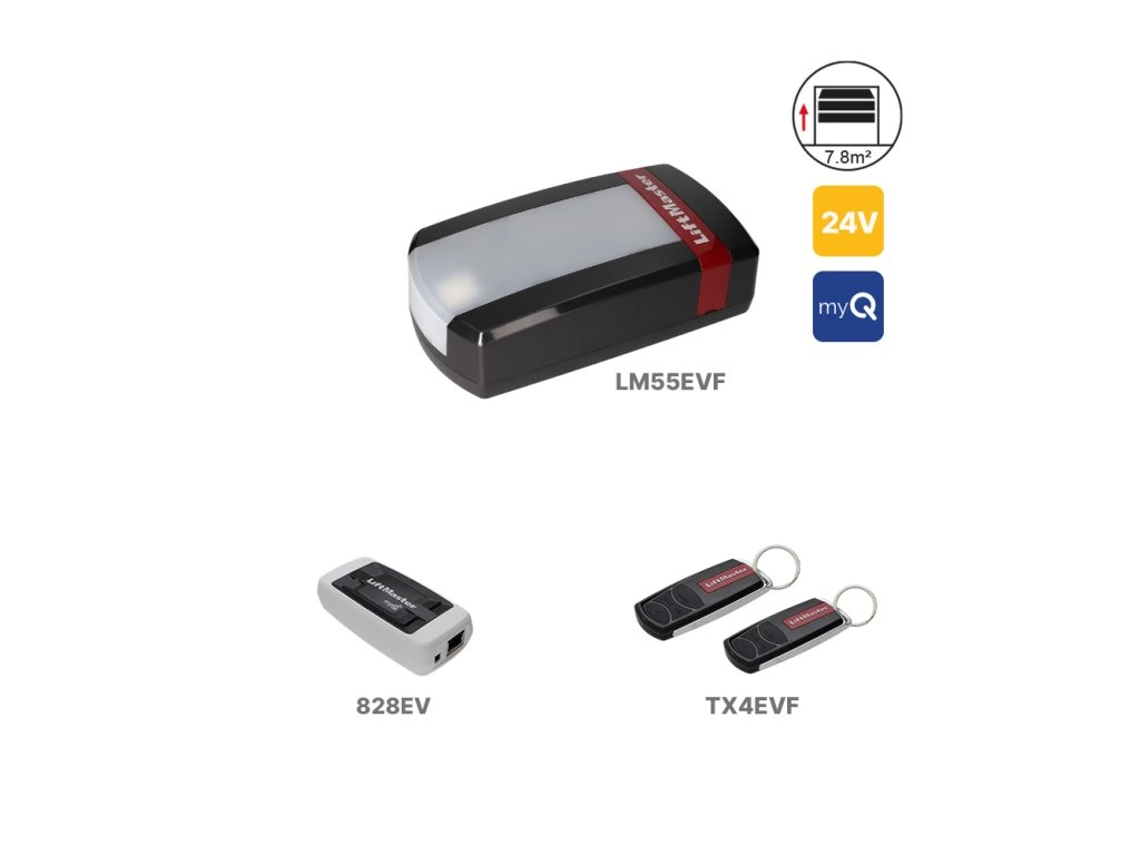 LiftMaster LM55EVF je kompaktný a spoľahlivý 24 V pohon určený pre garážové sekčné brány do hmotnosti 90 kg, so šírkou do 3,5 m a výškou do 2,25 m. Vďaka modernému dizajnu, integrovanému LED osvetleniu a podpore technológie myQ ponúka komfortné a inteligentné ovládanie brány prostredníctvom smartfónu, tabletu alebo počítača. Ovládanie aplikáciou myQ je podmienené inštaláciou fotobuniek (samostatne v predaji) a internetovej brány 828EV (súčasť balenia).