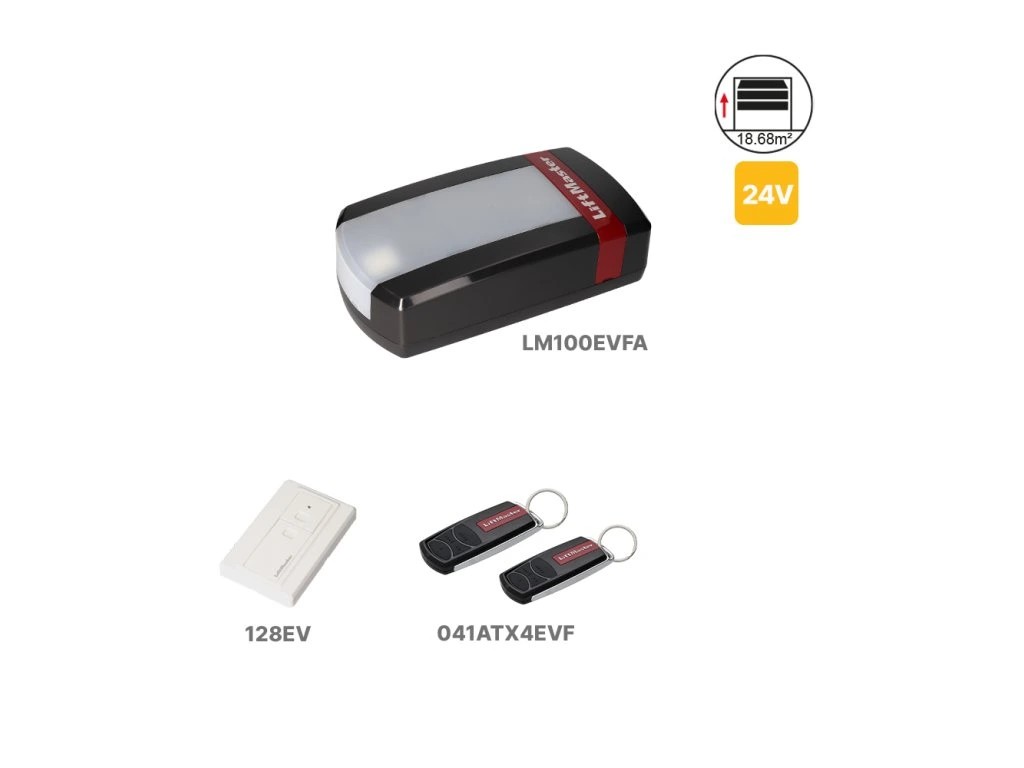 LiftMaster LM100EVFA je výkonný 24 V pohon určený pre garážové sekčné brány s hmotnosťou do 150 kg a maximálnymi rozmermi 5,75 m (šírka) × 3,25 m (výška). Vďaka rýchlosti otvárania a zatvárania 200 mm/s ide o jeden z najrýchlejších pohonov vo svojej triede. Navyše, s predĺženou zárukou 8 rokov na elektromotor získavate maximálnu spoľahlivosť a dlhodobú istotu.