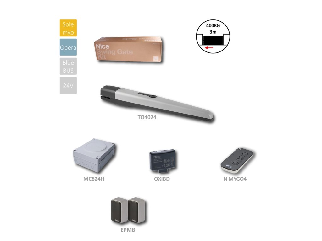 Sada pre jednokrídlovú bránu do 3m / krídlo, 1x TO4024 (24V, 120W, 1800N), 1x MC824H, 1x MYGO4, 1x OXI, 1 pár EPMB