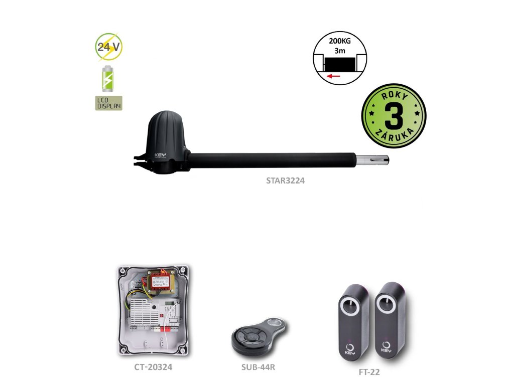 STAR3224 ľavý pohon pre jednokrídlovú bránu do 2m/krídlo, 1x STAR3224-L, 1x CT-20324, 1 pár FT-22, 1x SUB-44R