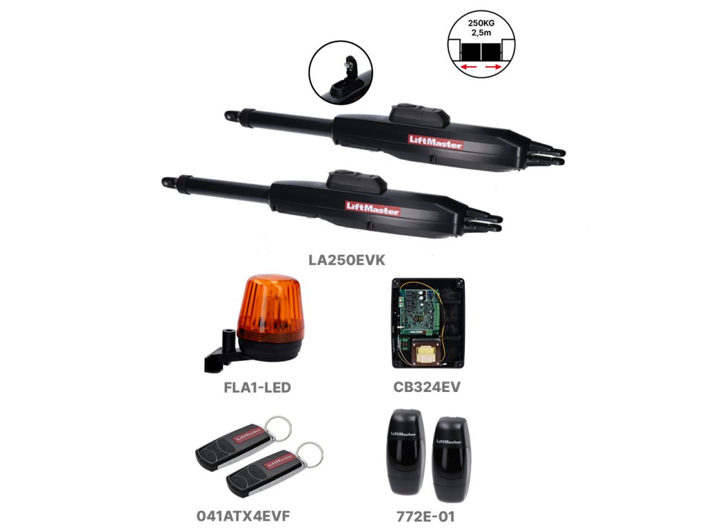LiftMaster LA250EVK-03 je kompletná sada pohonov pre rezidenčné krídlové brány so šírkou krídla do 2.5m na každé krídlo. Tento moderný pohon podporuje technológiu myQ, ktorá umožňuje ovládanie brány odkiaľkoľvek na svete prostredníctvom smartfónu, tabletu alebo počítača. Vďaka svojej odolnej konštrukcii a vysokej spoľahlivosti je ideálnym riešením pre bezpečnú a komfortnú prevádzku brány.