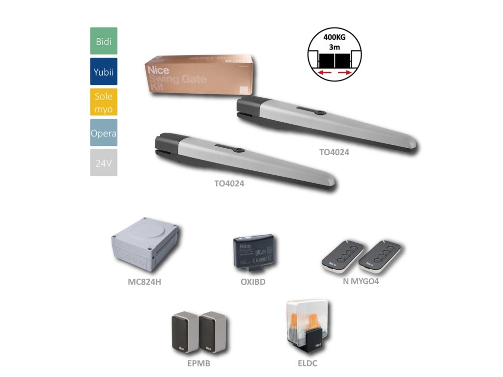 TO4024BDKCE sada pre dvojkrídlovú bránu, do 3m/krídlo, 2x TO4024 (24 V, 120 W, 1800 N), 1x MC824H, 2x MYGO4, 1x OXIBD, 1 pár EPMB, 1x ELDC