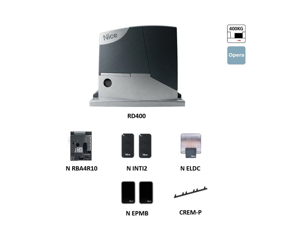 Sada RD400KCE-KH obsahuje všetko, čo potrebujete na automatizáciu vašej posuvnej brány do 400kg. Je ideálna pre rodinné domy a ľahké priemyselné použitie.