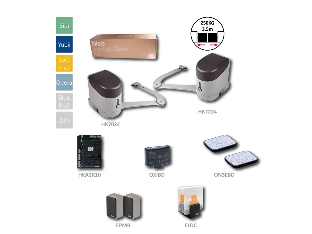 HYKEBDKCE sada ramenových pohonov pre dvojkrídlovú bránu do 3,5m/krídlo, 1x HK7224, 1x HK7024 s řídicí jednotkou HKA1, 2x ON3EBD, 1x OXIBD, 1 pár EPMB, 1x ELDC