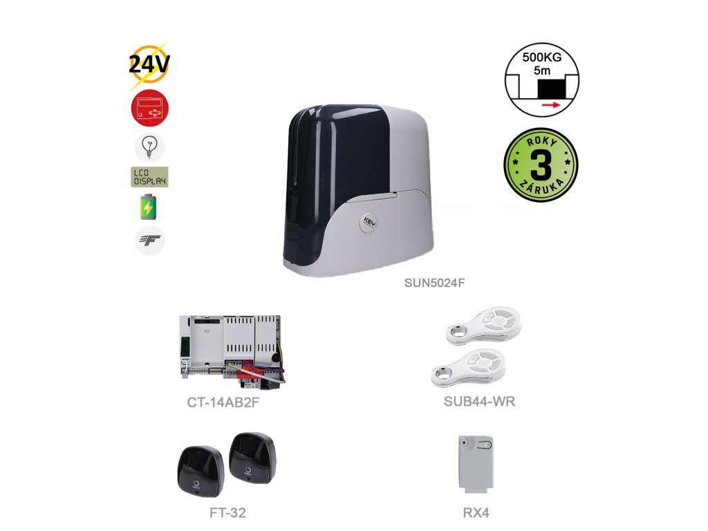 900KSUN5024FKR pre posuvnú bránu do 500 kg, 1x SUN5024F (24V, 300W, 23Nm), 1x CT-14AF, 1x RX4, 2x SUB44WR, 1 pár FT-22, magnetické koncové spínače