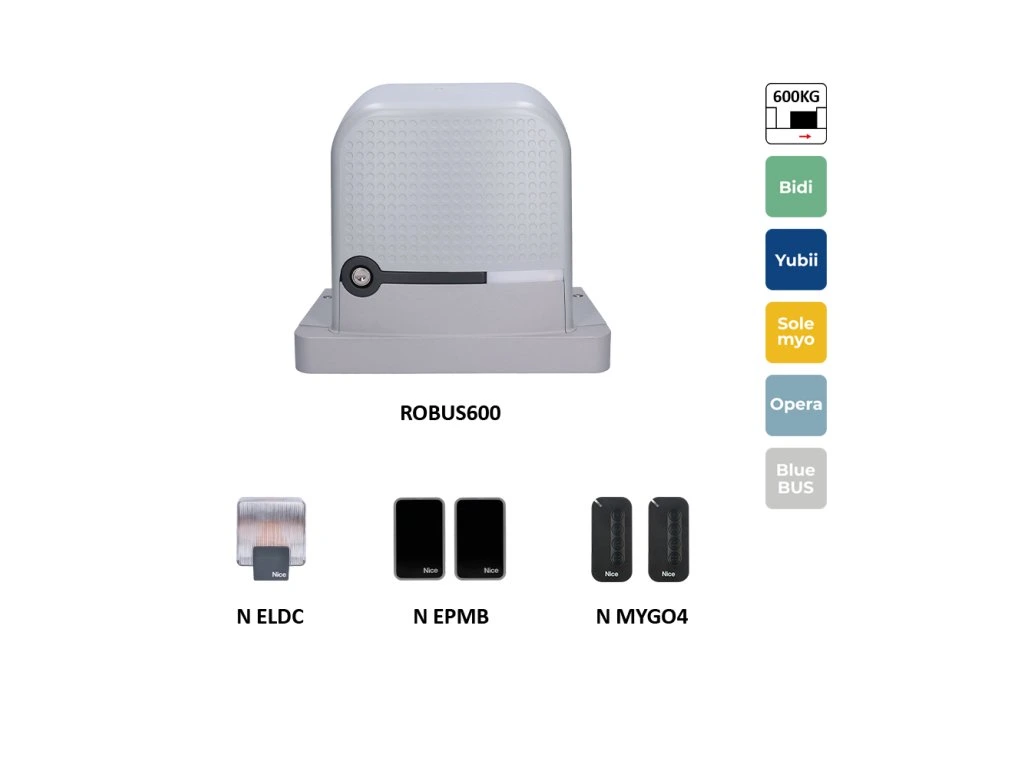 Robus600 je výkonný a spoľahlivý automatický pohon určený pre posuvné brány s maximálnou hmotnosťou až 600 kg. Tento model od spoločnosti NICE ponúka kombináciu vysokej rýchlosti, výkonu a bezpečnosti, čo z neho robí ideálnu voľbu pre rezidenčné aj komerčné použitie.
